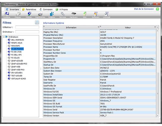 Afin de vous aider à optimiser votre infrastructure informatique et de mesurer l'adéquation entre votre parc actuel et le bon fonctionnement de vos activités, SasInventory effectue un inventaire des matériels (processeur, RAM, disque, etc.) et logiciels (licences, etc.) installés sur les ordinateurs du réseau, qu'ils soient sous Windows XP, 2000, Vista ou Windows 7.